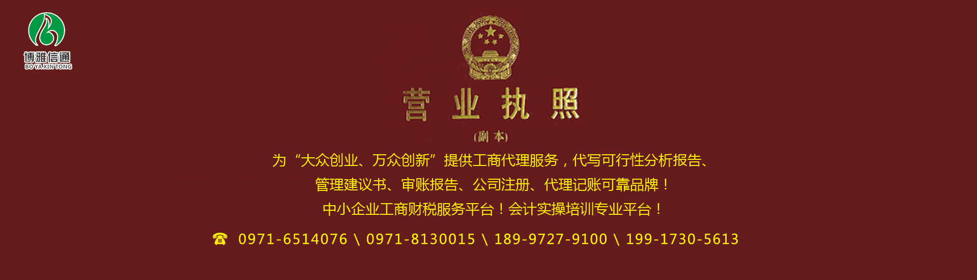 北京博雅信通會計服務(wù)有限公司西寧分公司為各中小企業(yè)提供各種專業(yè)工商財稅會計服務(wù)。包括公司設(shè)立籌劃、公司注冊、執(zhí)照變更、代辦注銷、代理記賬報稅、亂賬整理、會計實操培訓(xùn)、會計職稱培訓(xùn)(會計取證培訓(xùn))等一站式服務(wù)體系,誠信、專業(yè)、高效、省心! 公司簡介: 北京博雅信通會計服務(wù)有限公司西寧分公司 成立于2003年,積累了幾十個行業(yè)工商財稅會計服務(wù)經(jīng)驗,主要提供公司注冊、執(zhí)照變更、企業(yè)注銷、工商年報、代理記賬、納稅申報、會計培訓(xùn)、財稅顧問等一系列服務(wù)。全程工商財稅老板們甩手我們代理,并且用足用好工商財稅優(yōu)惠政策,讓企業(yè)老板省心、省時、省事兒!節(jié)約會計核算和納稅成本,解放您的寶貴時間抓好企業(yè)經(jīng)營,做您的...